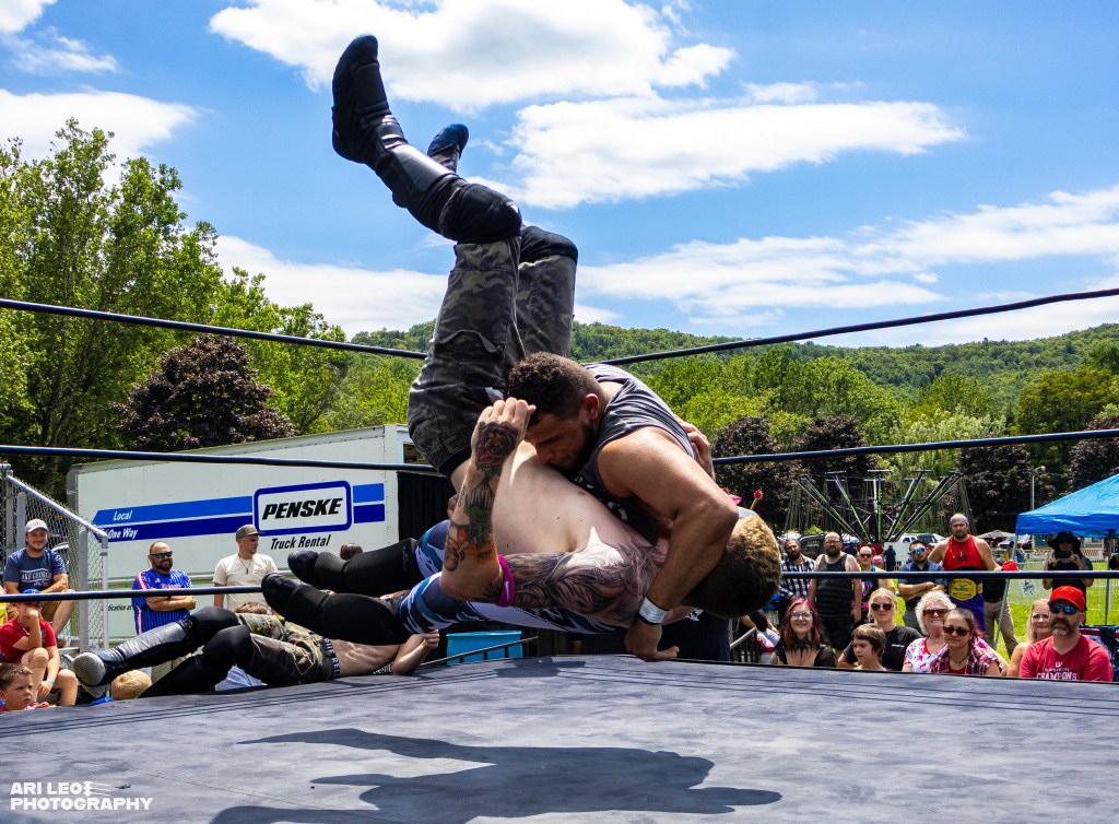 We had a No DQ match between Kaide Lothbrok and Michael Mistretta. I appreciated the tagline of “Nobody’s Betta than Michael Mistretta”, but Lothbrok invited him into his domain. There was brawling up and down the field outside of the ring, culminating in a dive by Lothbrok from the top of the production truck onto Mistretta. Lothbrok took him into the ring to finish him off with an RKO to end it. I couldn’t help but pop for this as I was wearing my RKO shirt. Was a fun match that had the crowd active to watch what was happening as they took advantage of the field.